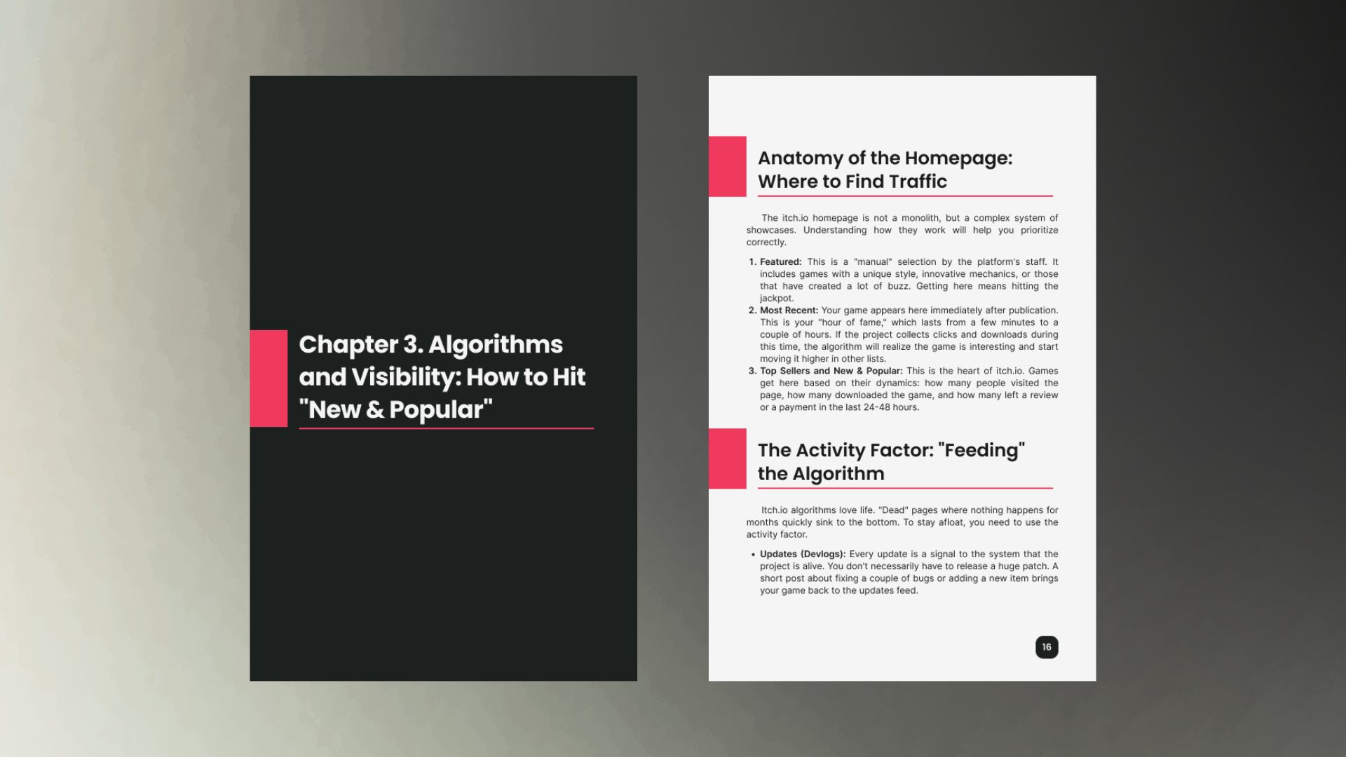 This is not a theoretical marketing book. It is a practical manual based on real experience, focused specifically on the unique ecosystem of itch.io.